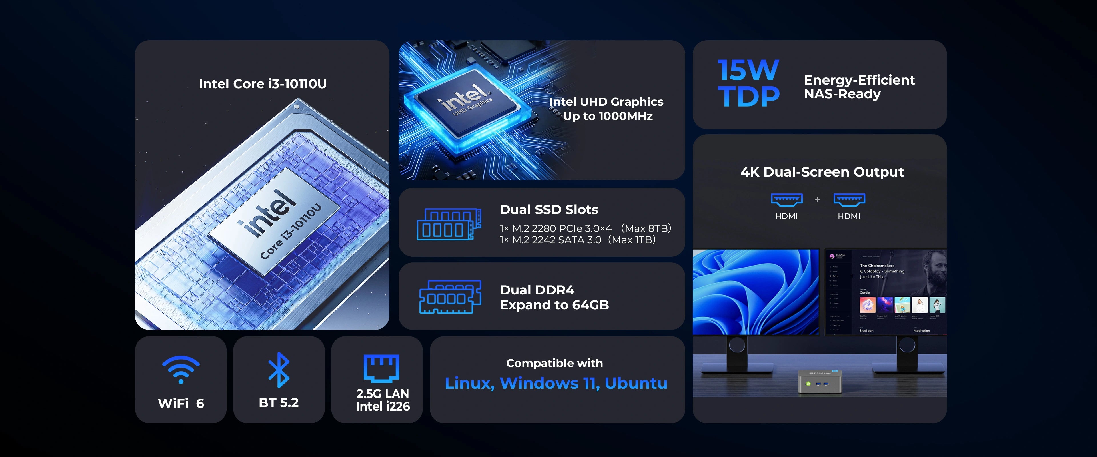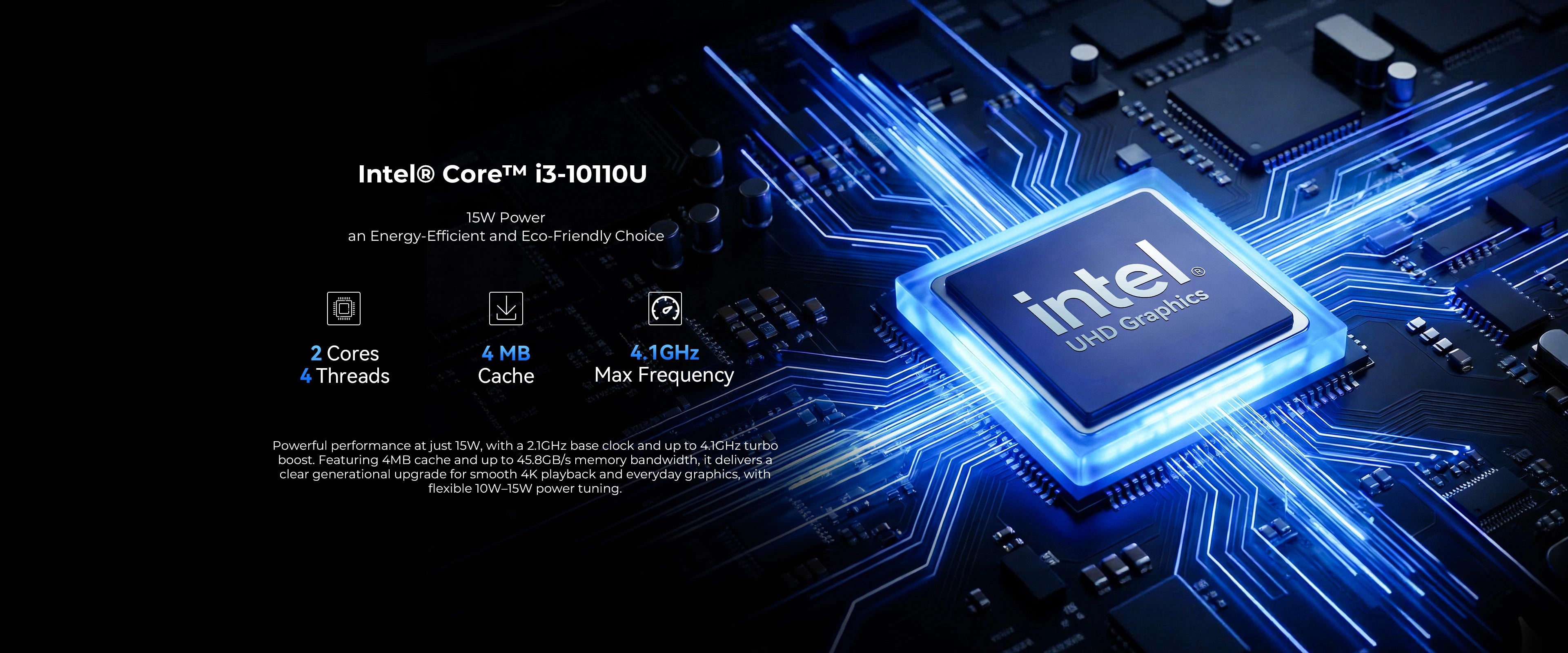 | CPU | 10th Gen Intel® Core™ i3-10110U, 2 Cores / 4 Threads, 14nm, 2.1 GHz Base / up to 4.1 GHz Turbo 4 MB Cache; Power Modes: 8W (Silent) / 10W (Balanced) / 15W (Performance) Cooling: Single Fan 5008 + D8 Copper Heat Pipe |