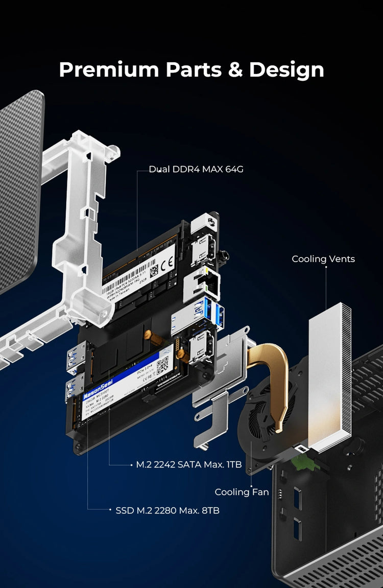 | Speichererweiterung | 1 × M.2 2280 PCIe Gen3 ×4, bis zu 8TB (kompatibel mit SATA SSD) 1 × M.2 2242 SATA3.0, bis zu 1TB (kein PCIe-Support) BIOS liest zuerst SATA SSD |