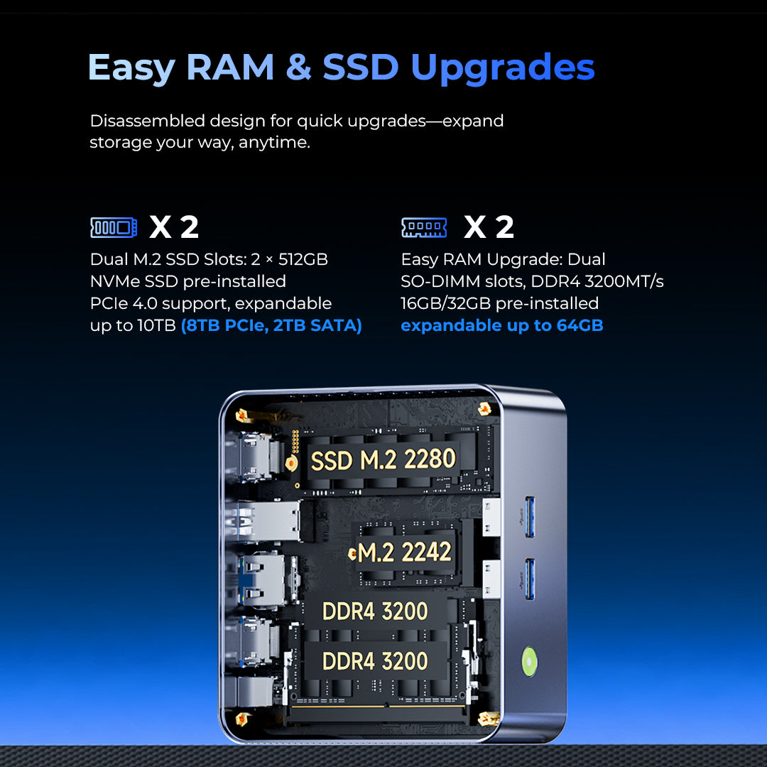 With up to 64GB memory and 10TB storage, the M2 Pro S handles Excel, Photoshop, and other apps with ease—while giving you ample room to expand, so you can work and play without limits.