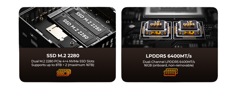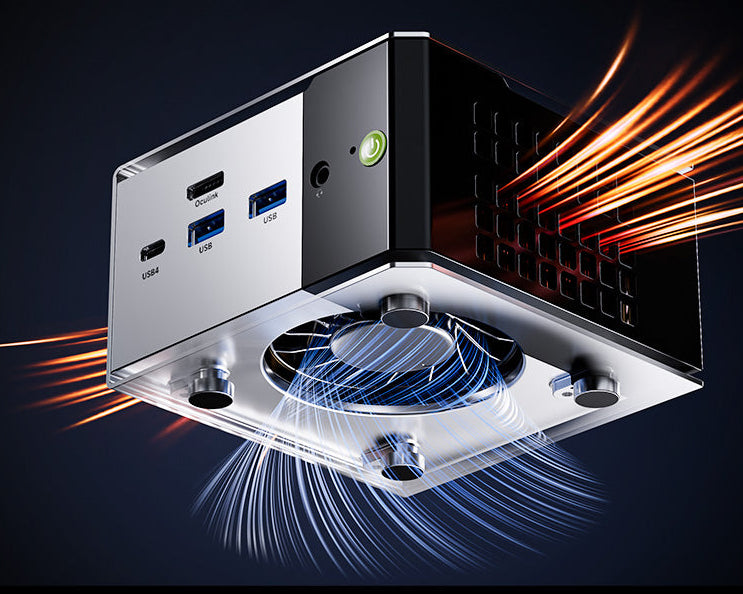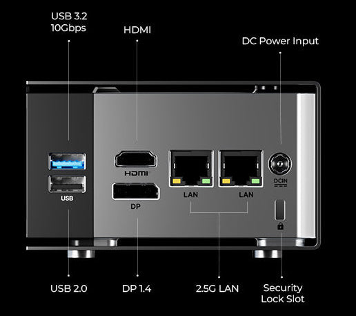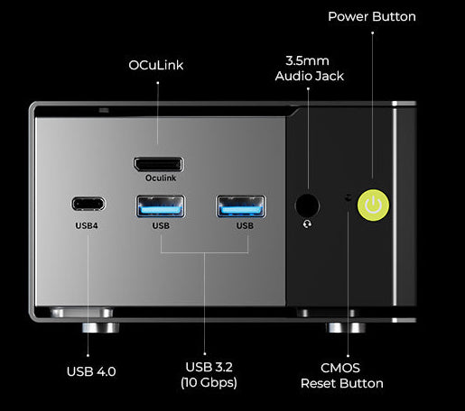 M8 verfügt über eine umfangreiche Schnittstellenausstattung: Am Frontpanel befinden sich USB 4.0 × 1, OCuLink × 1, USB 3.2 (10 Gbps) × 2, ein 3,5-mm-Audioanschluss × 1, eine CMOS-Reset-Taste × 1 und eine Power-Taste × 1. Auf der Rückseite befinden sich USB 3.2 (10 Gbps) × 1, USB 2.0 × 1, HDMI 2.0 × 1, DisplayPort 1.4 × 1, 2,5G LAN × 2, ein DC-Stromanschluss × 1 sowie ein Sicherheits-Slot × 1.