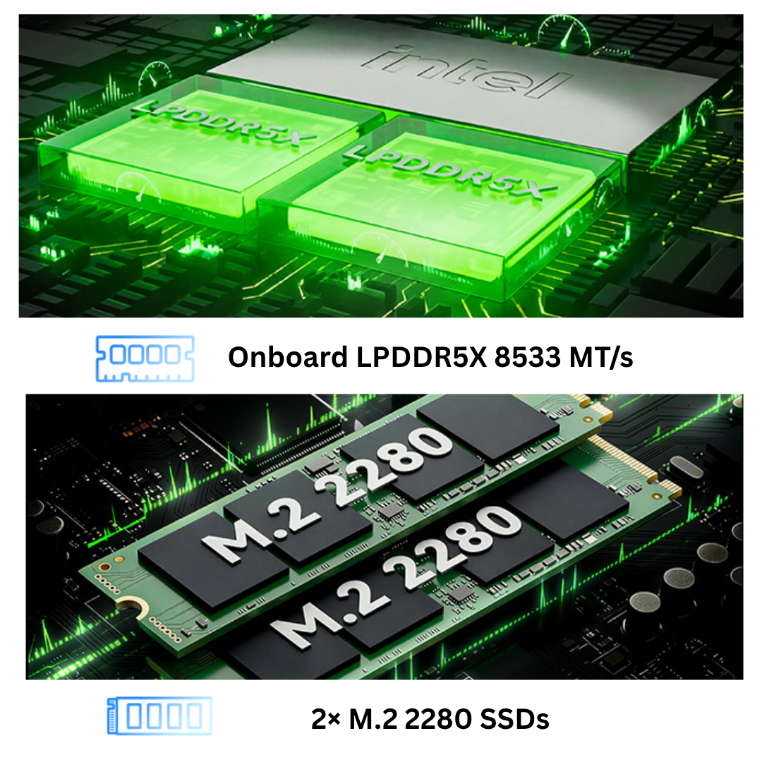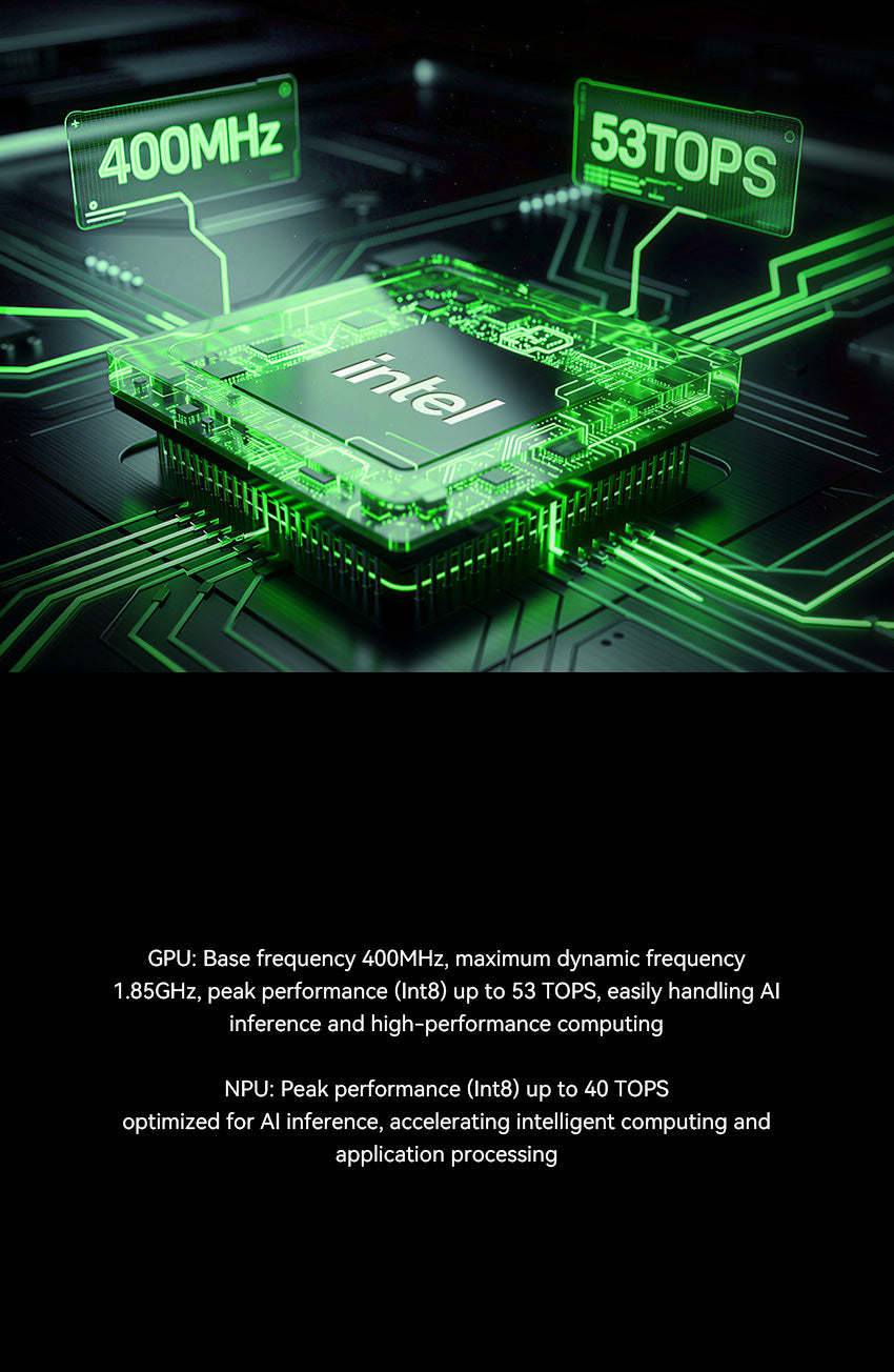 GPU mit 400 MHz Basis- und 1,85 GHz Boost-Frequenz liefert bis zu 53 TOPS Int8 für KI-Inferenz und Hochleistungsberechnungen, während die NPU bis zu 40 TOPS Int8 erreicht und intelligente Anwendungen beschleunigt.