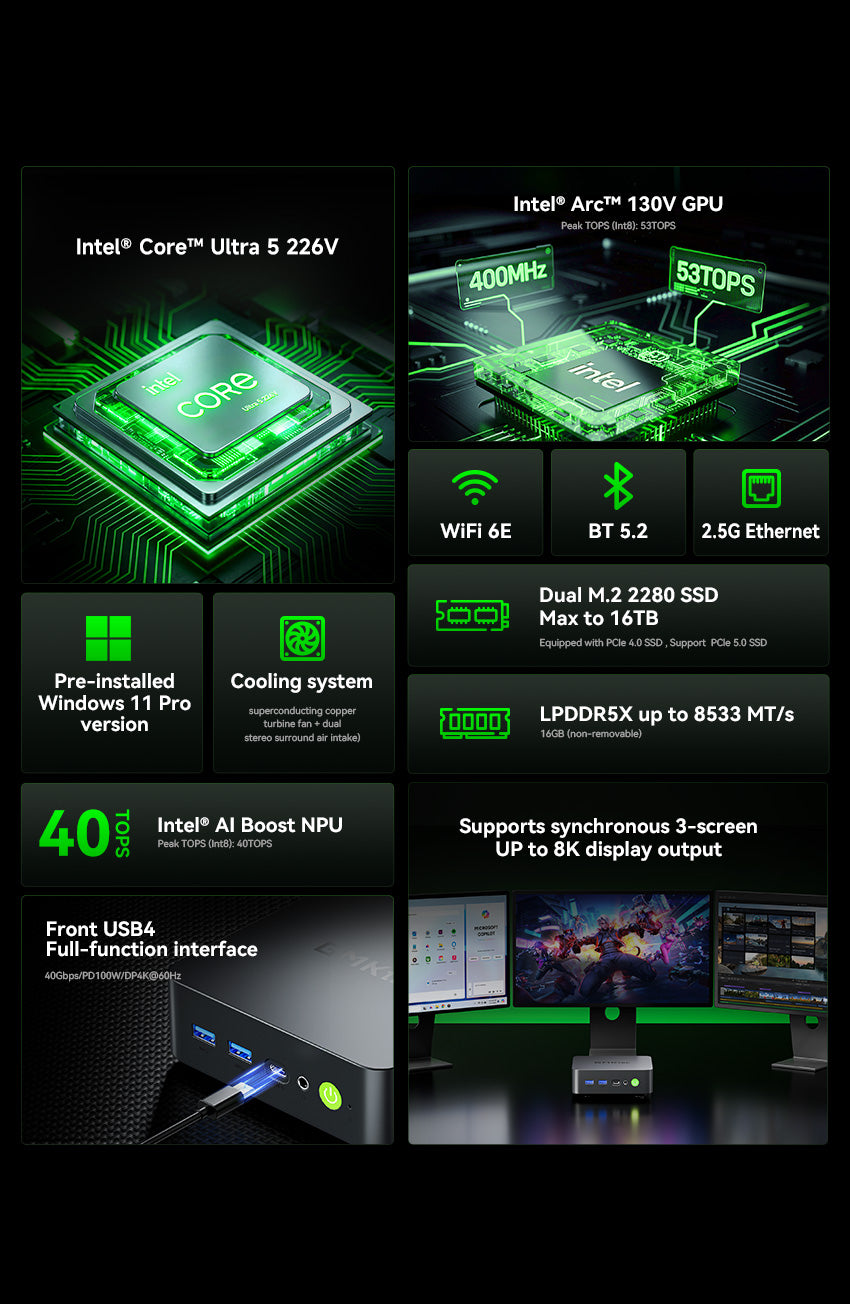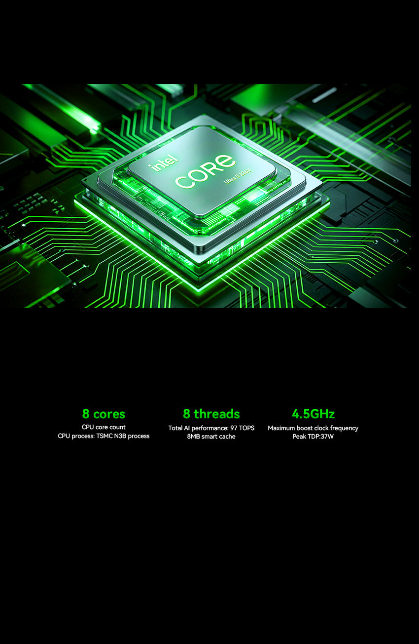 Intel® Core™ Ultra 5 226V – 4,5 GHz Boost bei 37 W TDP. Mit 8 Kernen und 8 Threads liefert er bis zu 97 TOPS KI-Leistung. 8 MB intelligenter Cache auf TSMC N3B-Prozess sorgen für hohe Effizienz und starke Performance.