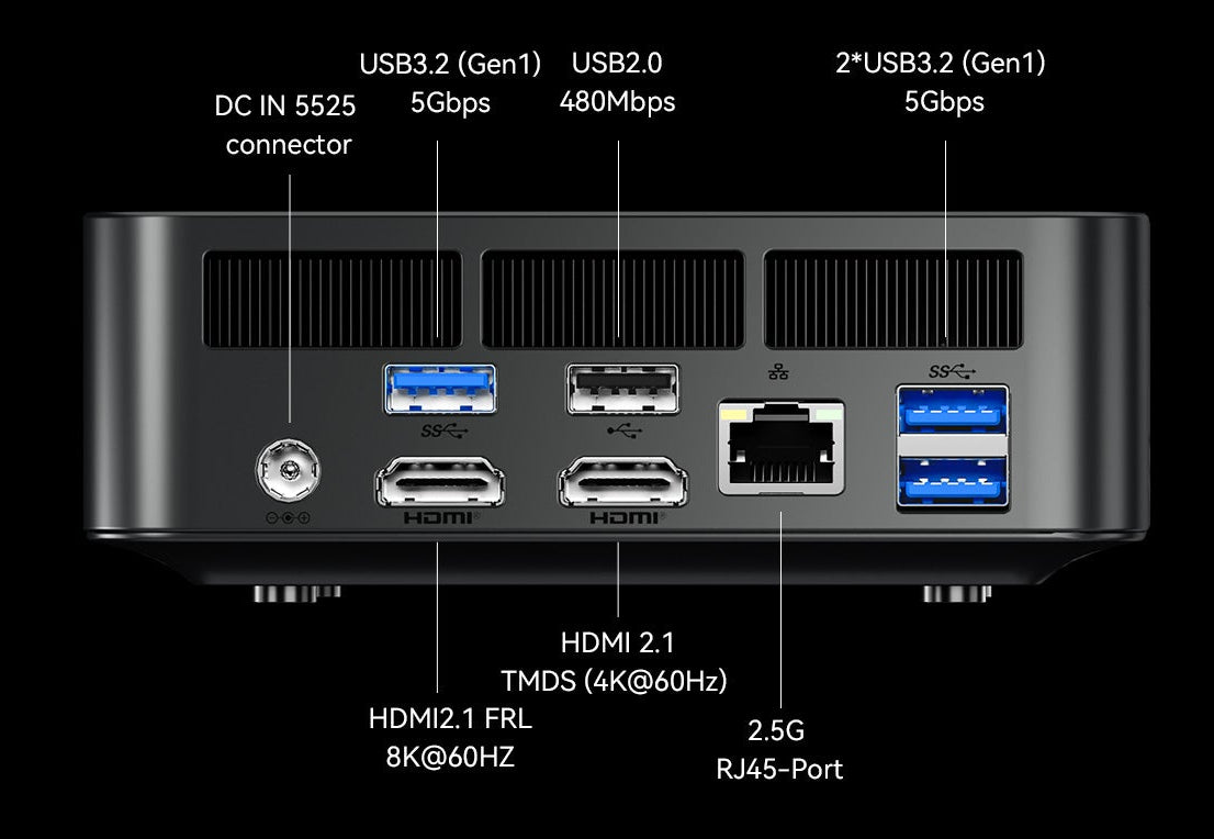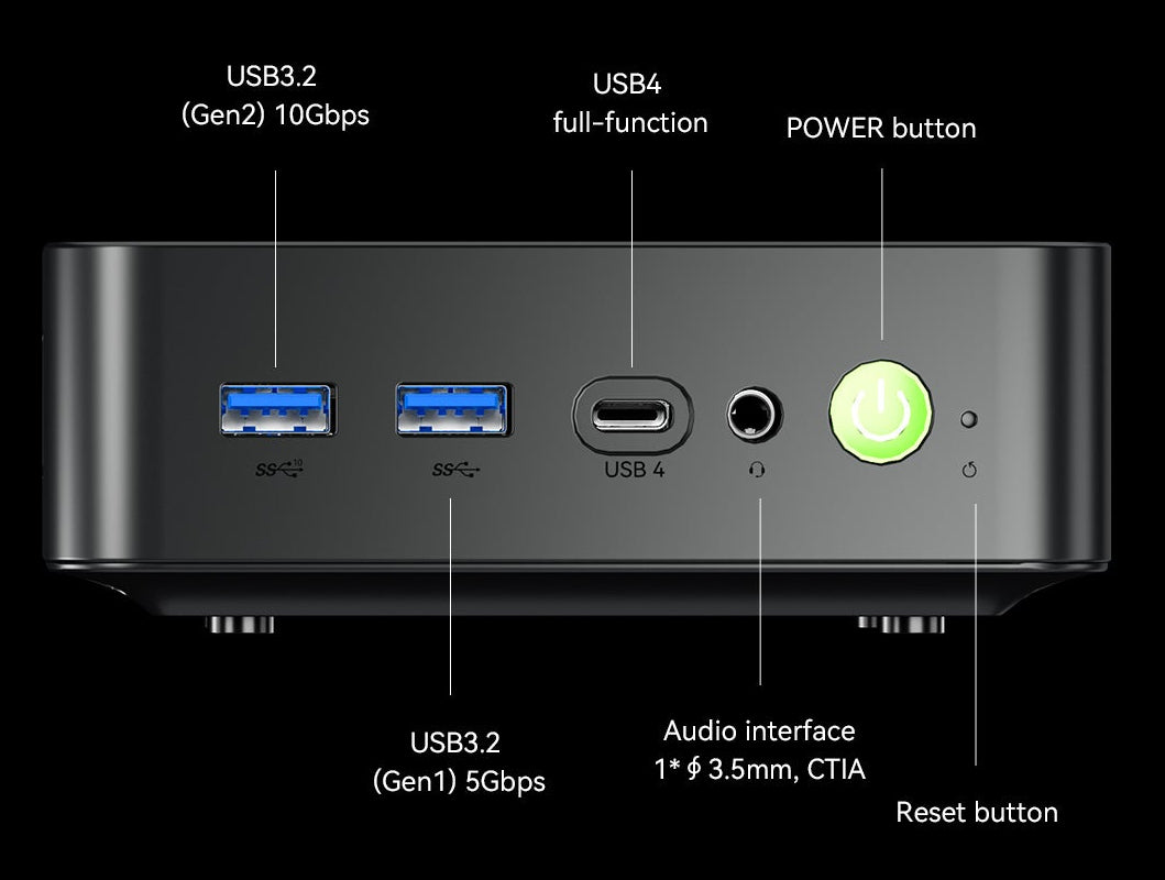 Vorderseite Schnittstellen: 1* POWER-Taste 1* Reset-Taste (setzt bei Booten zurück, löscht CMOS-Einstellungen beim Herunterfahren) 1* USB3.2 (Gen2) 10Gbps 1* USB3.2 (Gen1) 5Gbps 1* USB4 Vollfunktion Audioanschluss: 1*∮3.5mm, CTIA Rückseite Schnittstellen: 1* HDMI 2.1 TMDS (4K@60Hz) + 1* HDMI 2.1 FRL(8K@60HZ) 1* USB2.0 480Mbps 3* USB3.2 (Gen1) 5Gbps 1* DC IN 5525 Anschluss 1* 2.5G RJ45-Port 1* Schließmechanismus