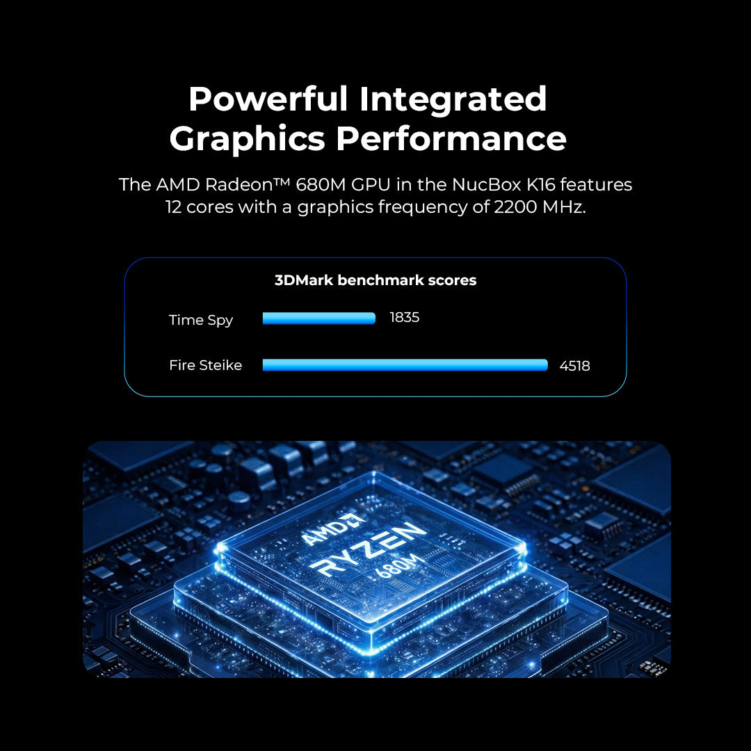 Die AMD Radeon™ 680M GPU im NucBox K16 verfügt über 12 Kerne mit einer Grafikfrequenz von 2200 MHz.