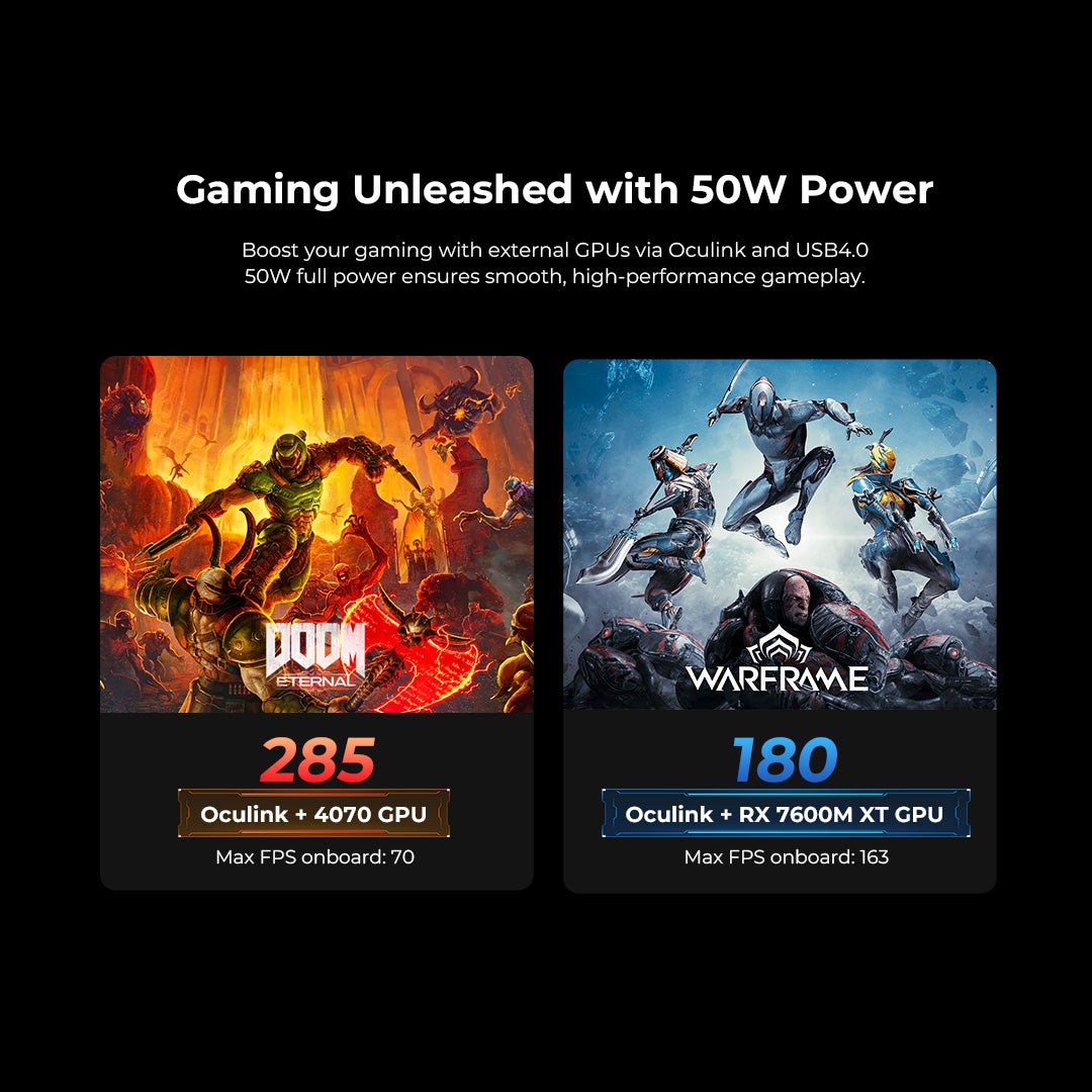Steigern Sie Ihr Gaming mit externen GPUs über Oculink und USB4.0. 50W volle Leistung für flüssiges, leistungsstarkes Gameplay.