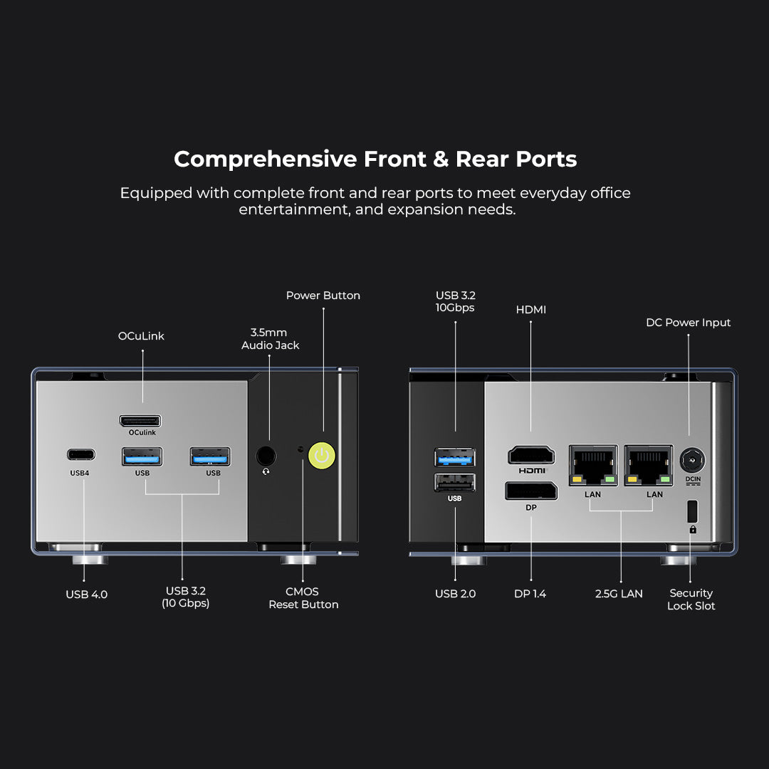 Front: 1× vollfunktionales USB4 (40 Gbps / PD100W / DP1.4), 2× USB 3.2 Gen2 (10 Gbps), 1× OCulink (PCIe Gen4 x4), 1× 3,5-mm-Audioanschluss (CTIA), 1× Ein-/Aus-Schalter mit weißer LED sowie 1× Reset-Loch.