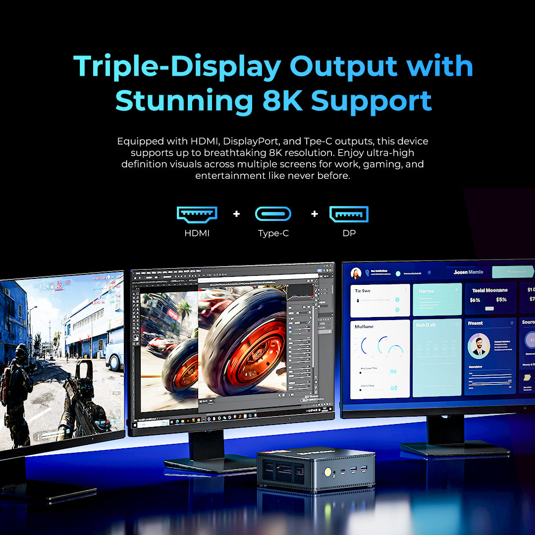 HDMI+DP+type-c outputs, supporting up to 8K resolution